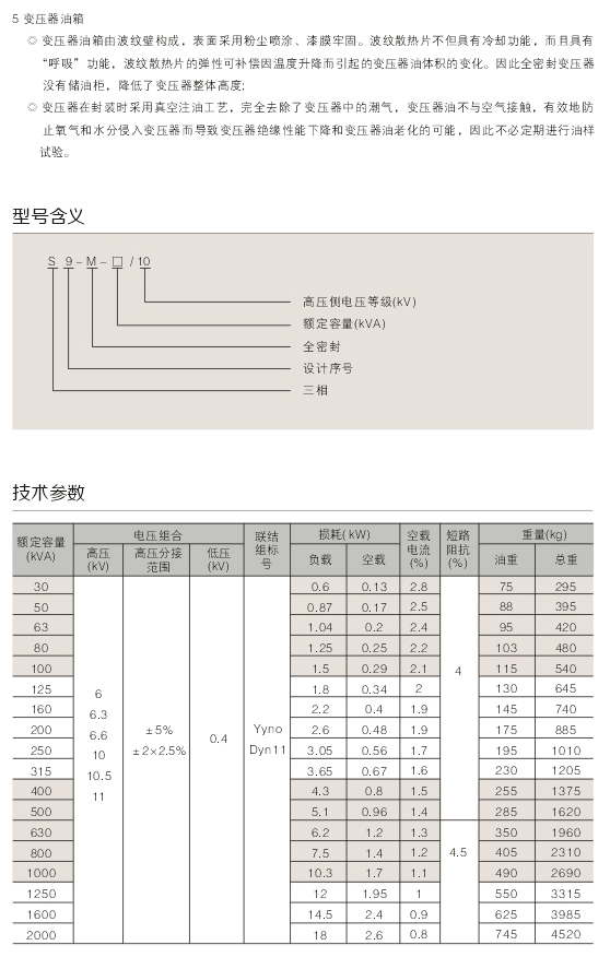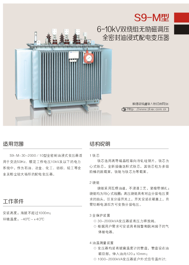 S9- M- 30~2000/ 10型全密封油浸式變壓器適.用于交流50Hz、額定工作電壓10kV及以下的電力系統(tǒng)中,作為石油、冶金、化工、紡織、輕工等企業(yè)及粉塵較大場所的配電變壓器。